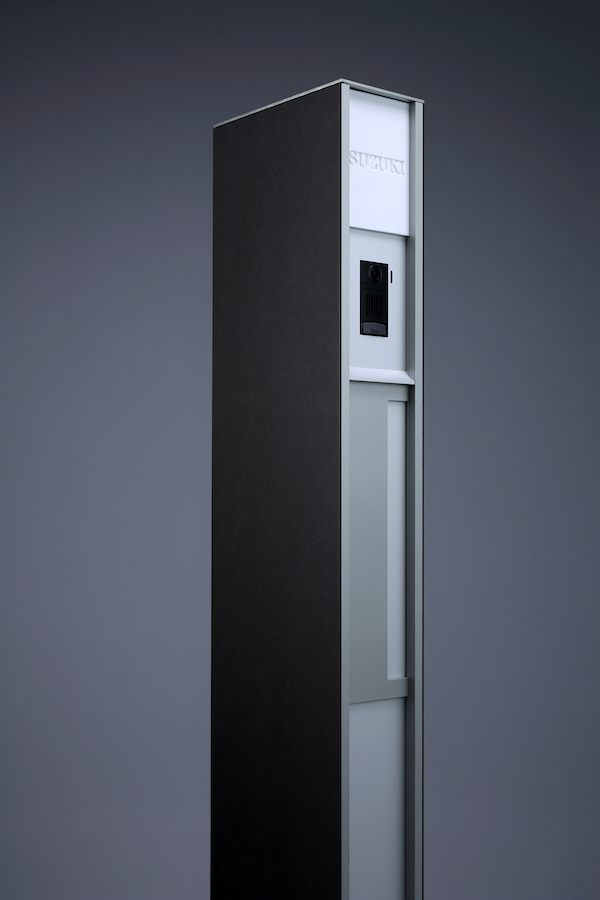エンブレムポストTYPE Lは、引き締まった身体を思わせる無垢のアルミニウムならではの質感、圧迫感のないキリリとしたプロポーションに凝縮した機能、という二つのデザイン要素を、日本の製造現場の加工技術力が支えている。