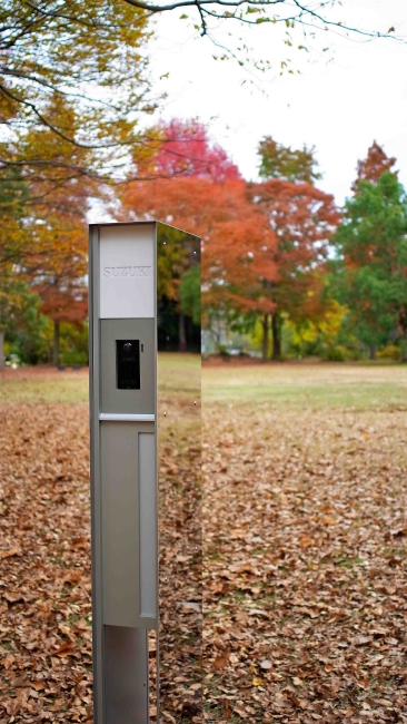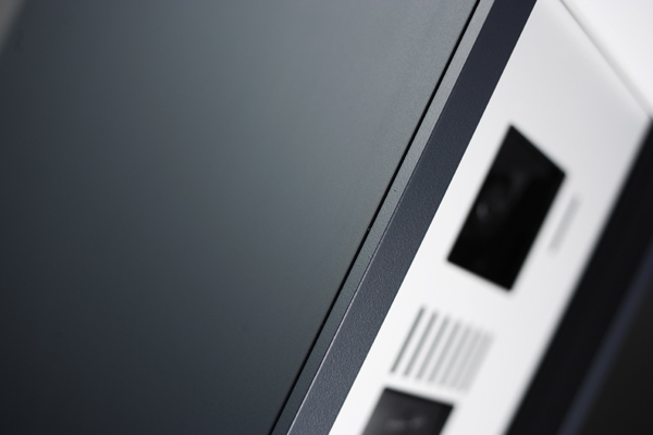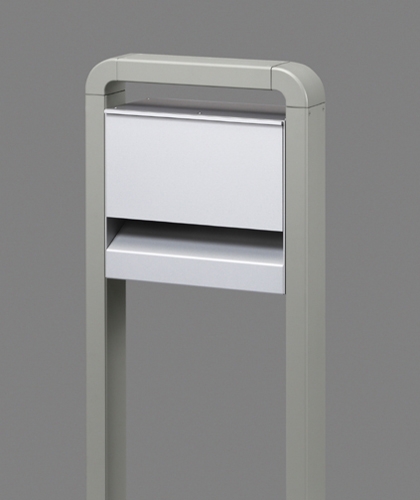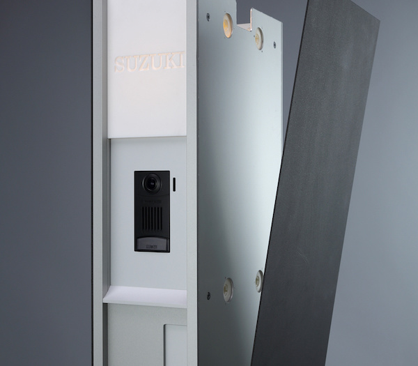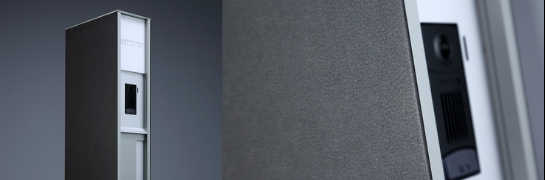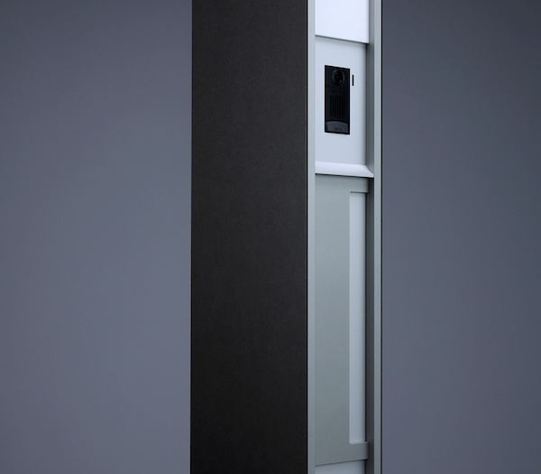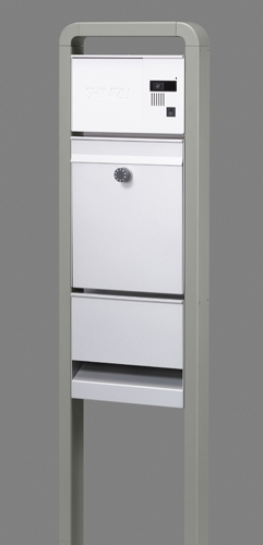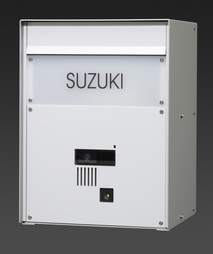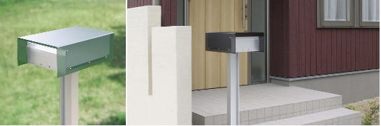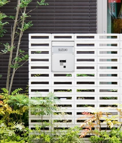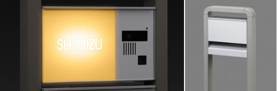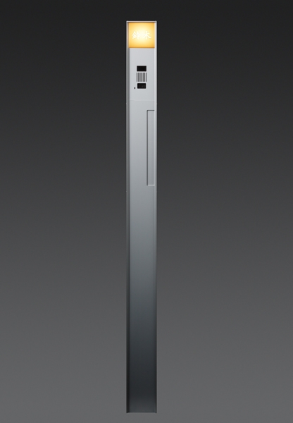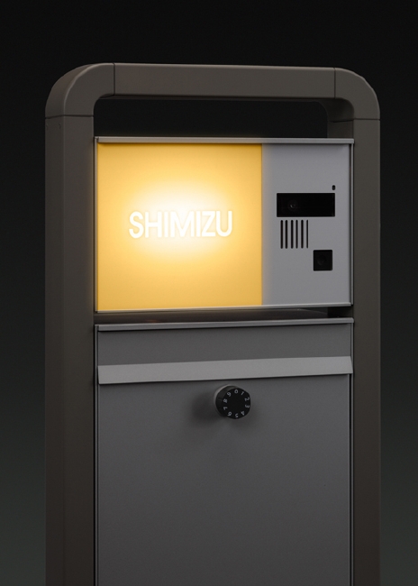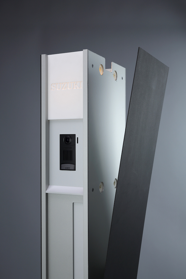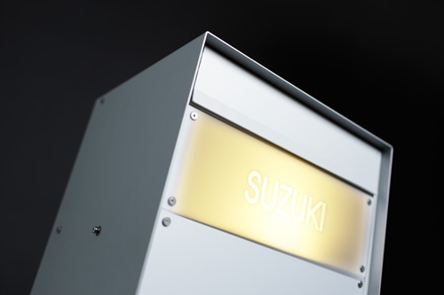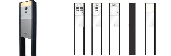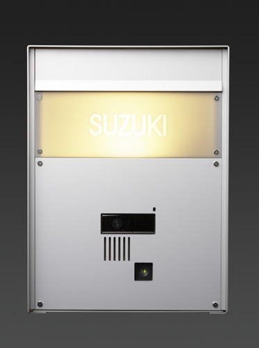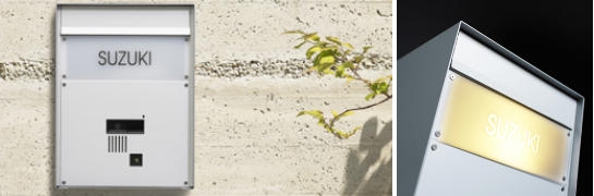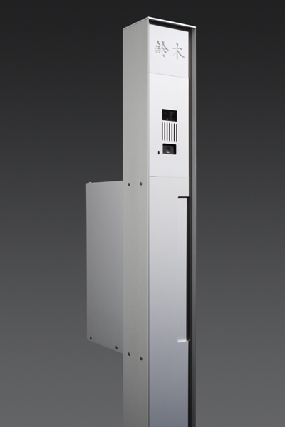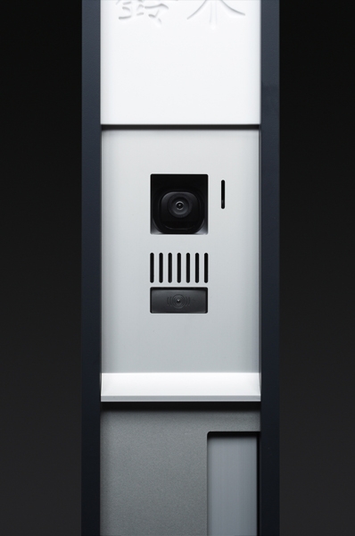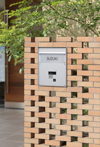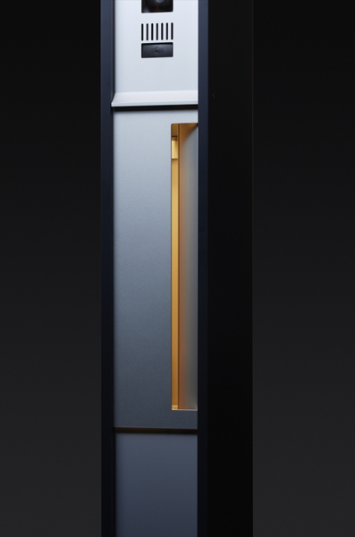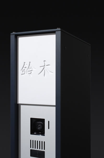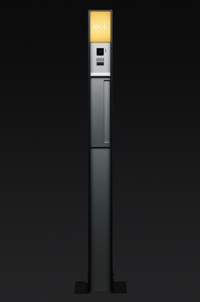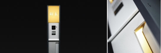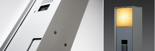 前後の2タイプから選べるスライド式の郵便物取り出し口、二世帯にまで対応可能な内蔵式インターホン部、建物のライトアップにも役立つエンブレム表札灯も装備。明暗センサーの内蔵にまで対応する、多機能門柱である。