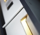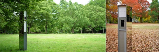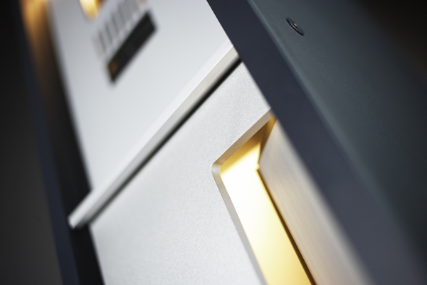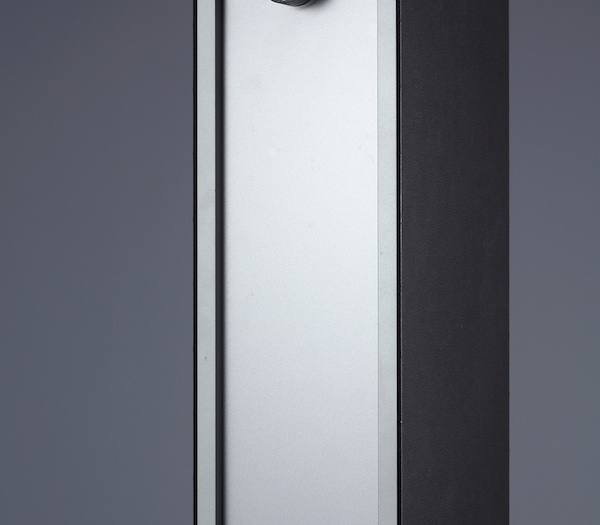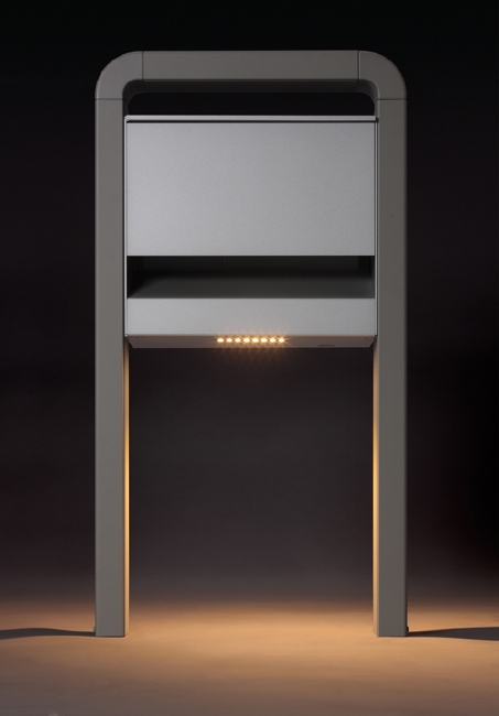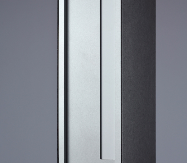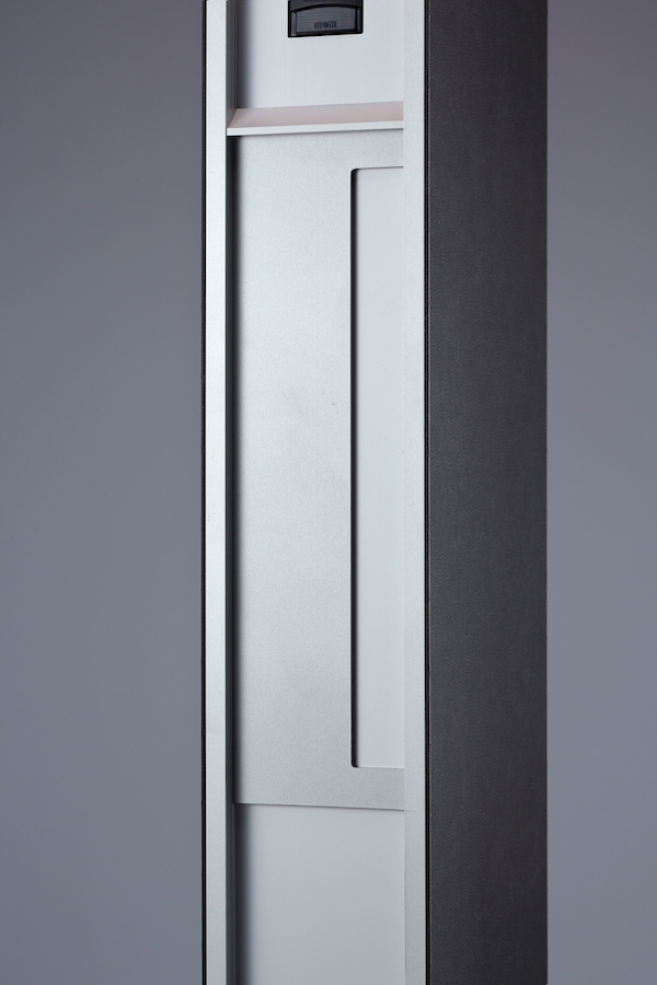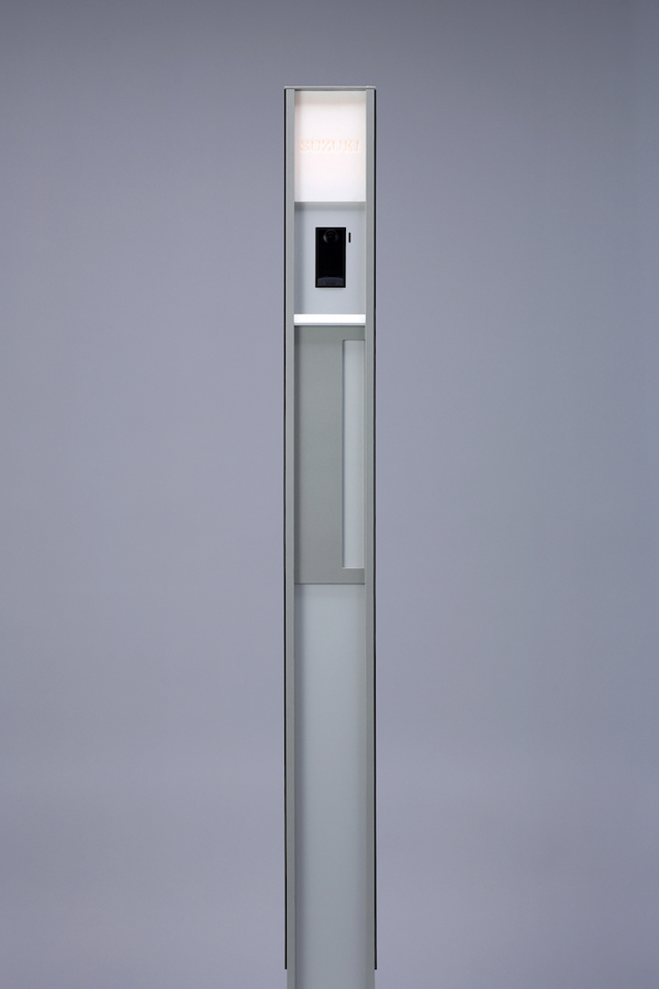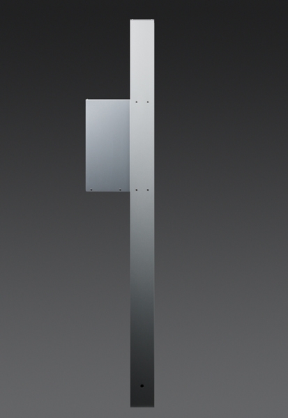 エンブレムポストTYPE Lは、引き締まった身体を思わせる無垢のアルミニウムならではの質感、圧迫感のないキリリとしたプロポーションに凝縮した機能、という二つのデザイン要素を、日本の製造現場の加工技術力が支えている。