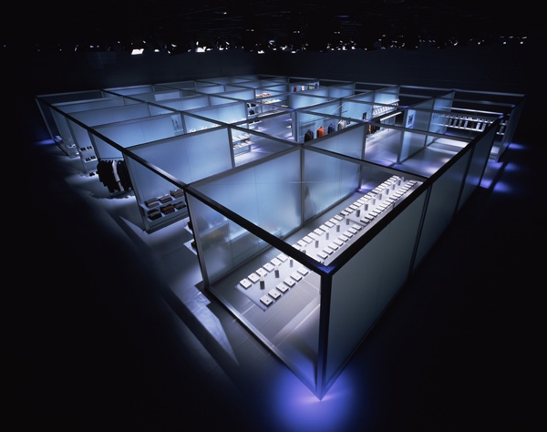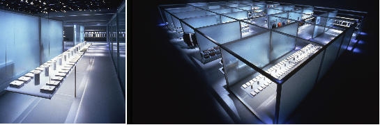 会場の基本構成は、ローコストで、いつでも入手でき、簡単に組み立てられ、再利用できる、工業生産性が高いアルミ-ステンレス-ガラス-アクリルを組み合わせて透明感ある空間と、いくつかの基本部材(パーツ)を組み合わせることで、数時間の施工で完成させるという条件にも対応した、システムデザインを構築した。